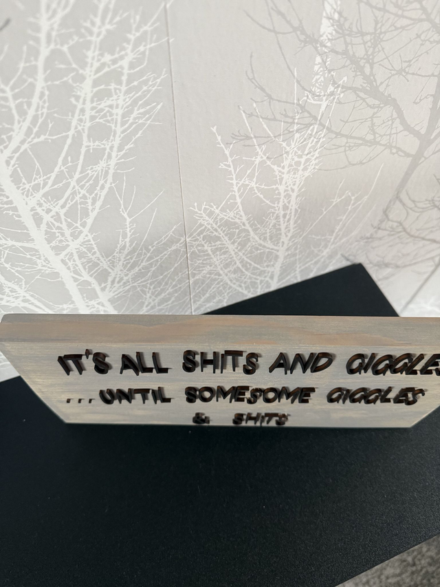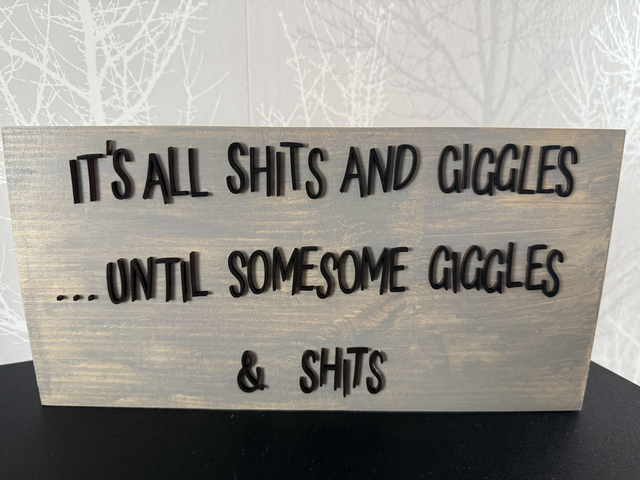 Handmade sign ‘it’s all shits and giggles until someone giggles and shits’ freestanding sign
